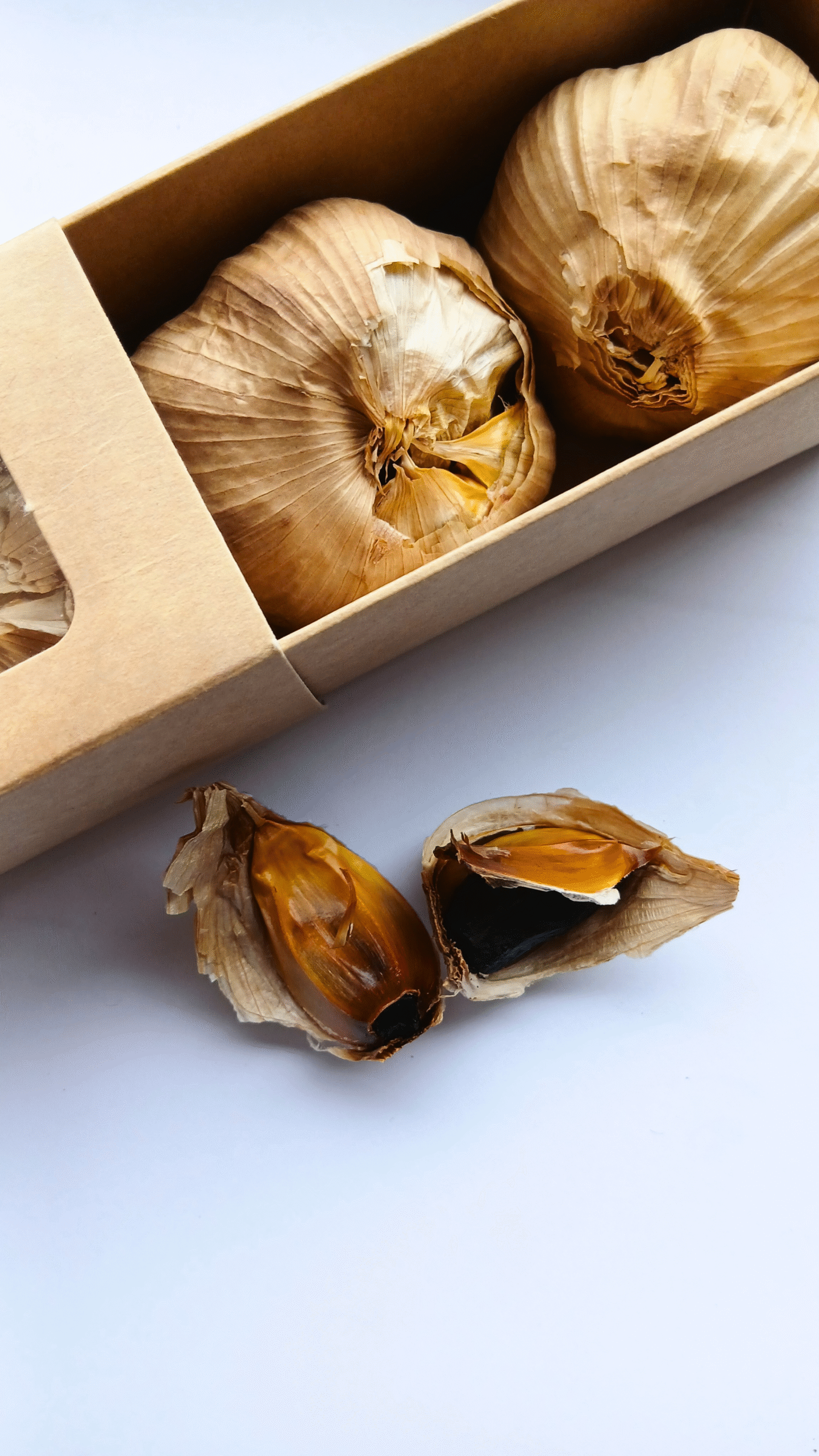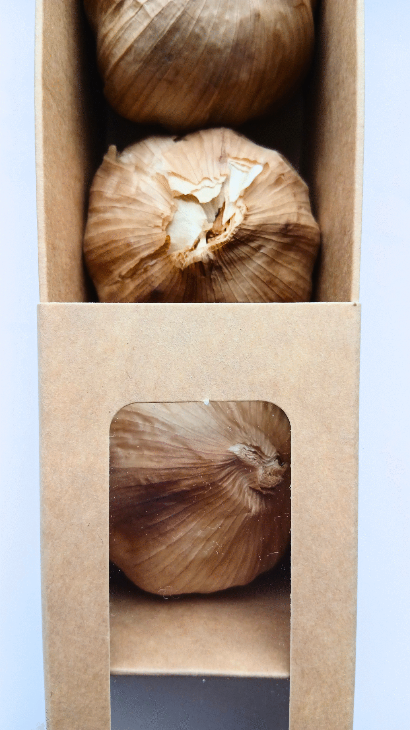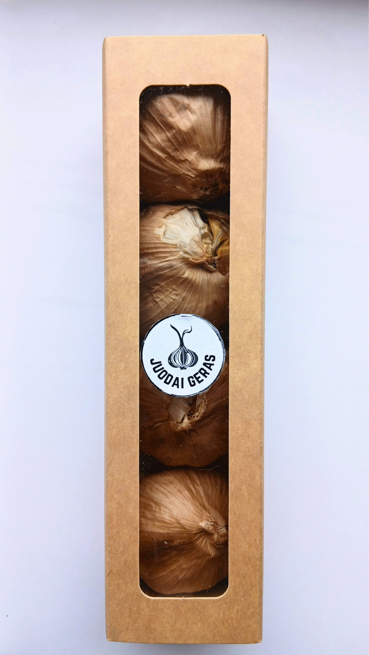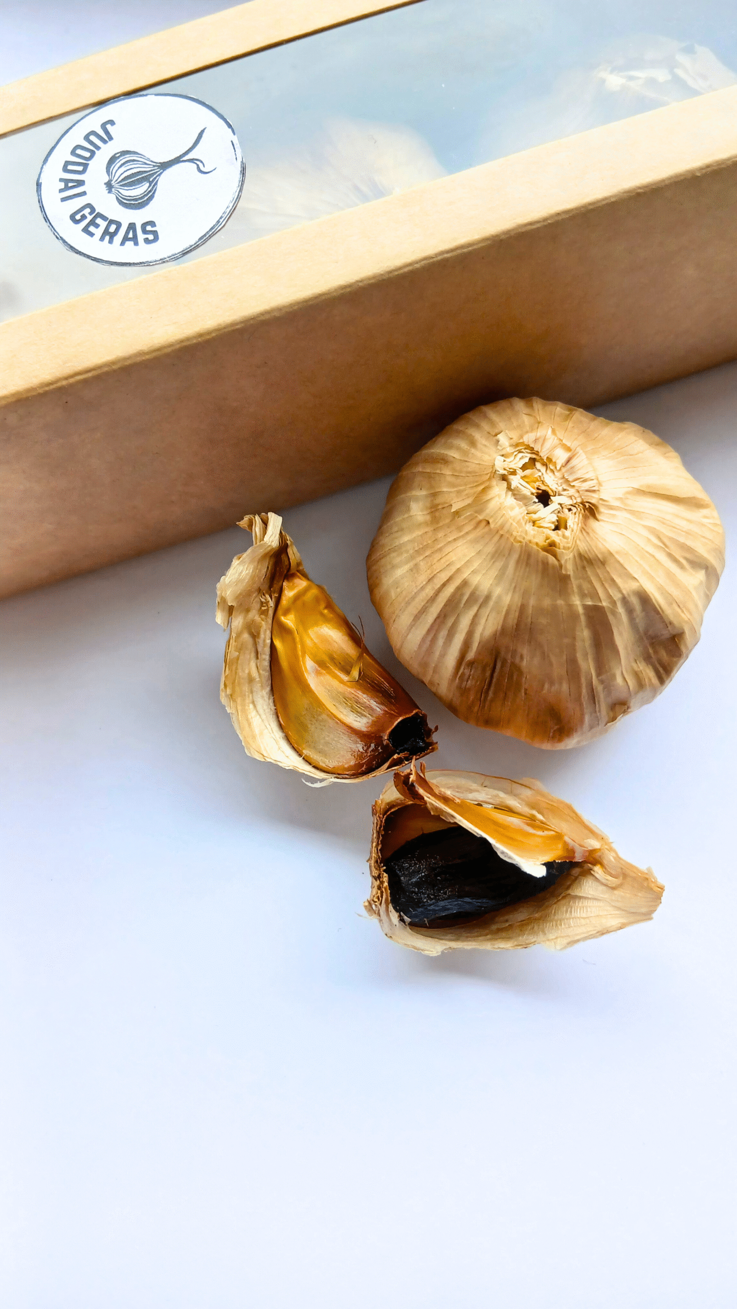 Dežutėje rasite keturias juodojo česnako galvutes. Jos fermentuotos apie 10 dienų. Puikiai tinka pagardinti kasdienius patiekalus.